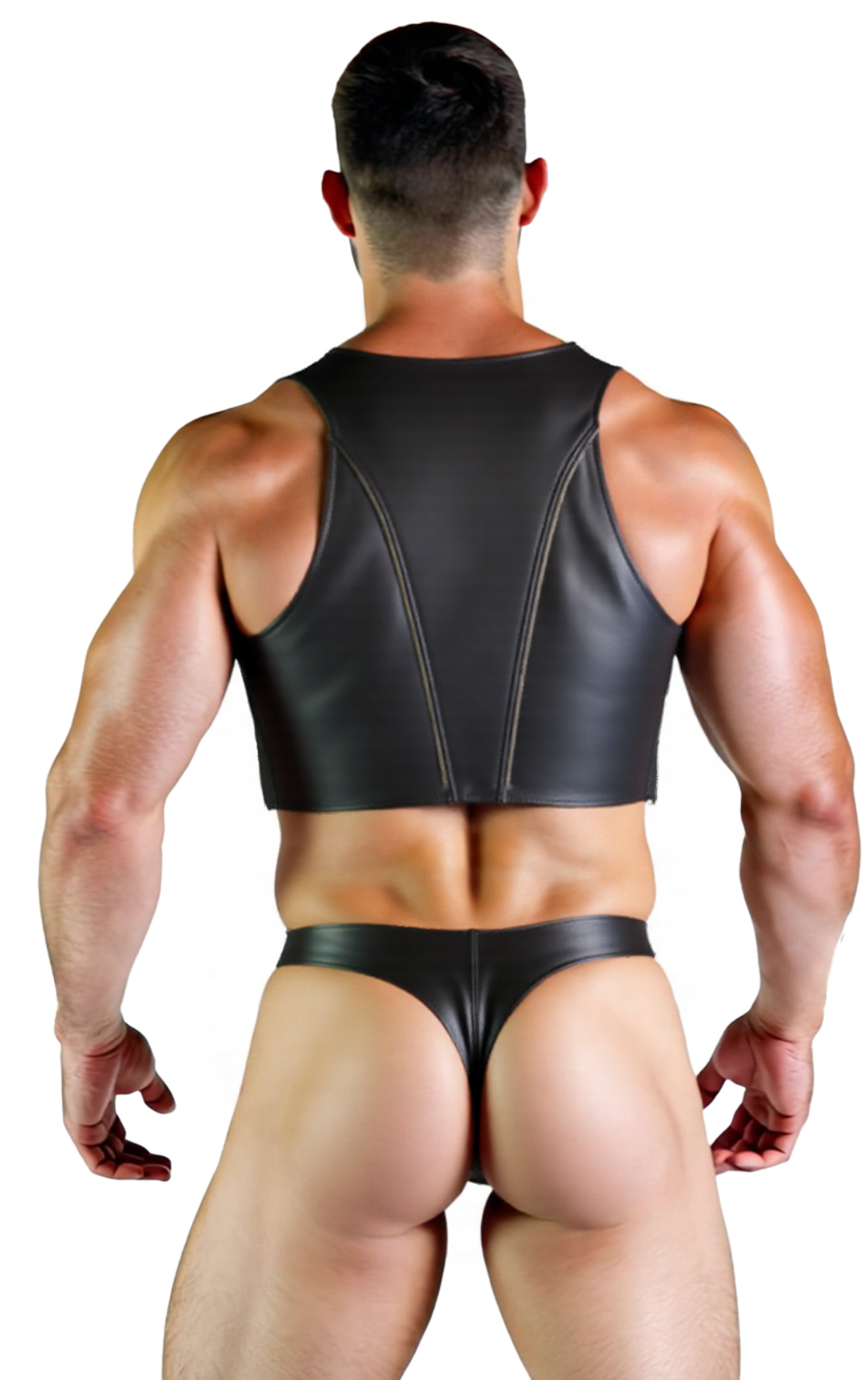 Unleash your desires with this bold vest-jock hybrid that perfectly blends leather seduction with raw power, enhancing your physique while igniting passion.