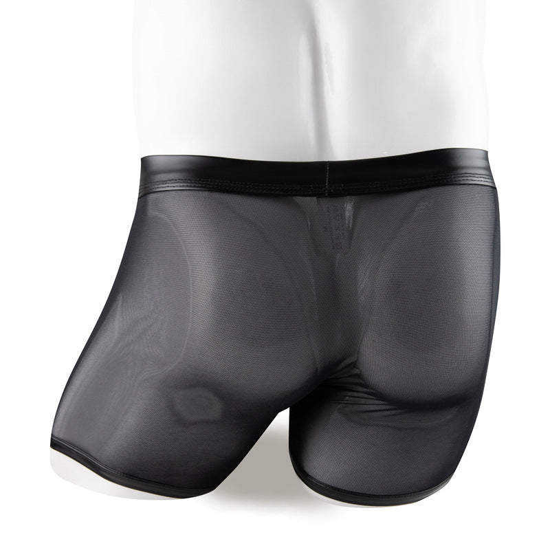 Ignite passion with our provocative open-front boxers that blend bold patent leather with sheer mesh, creating an alluring look that encourages confidence and allure.